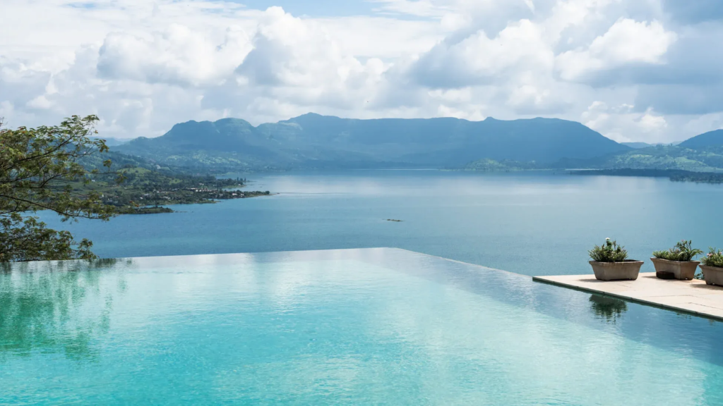Lonavala’s mild climate makes private pool villas particularly appealing. The most scenic options pair pools with elevated or open views, allowing guests to swim while surrounded by hills or forests.